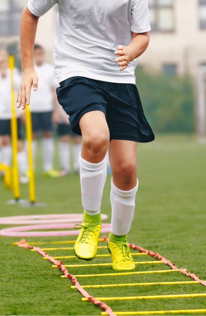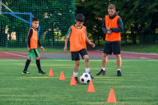 تمارين لتطوير مهارات المراوغة، مثل المراوغة بالكرة بين الأقدام أو حول الجسم، مع التركيز على التحكم بالكرة والسرعة.